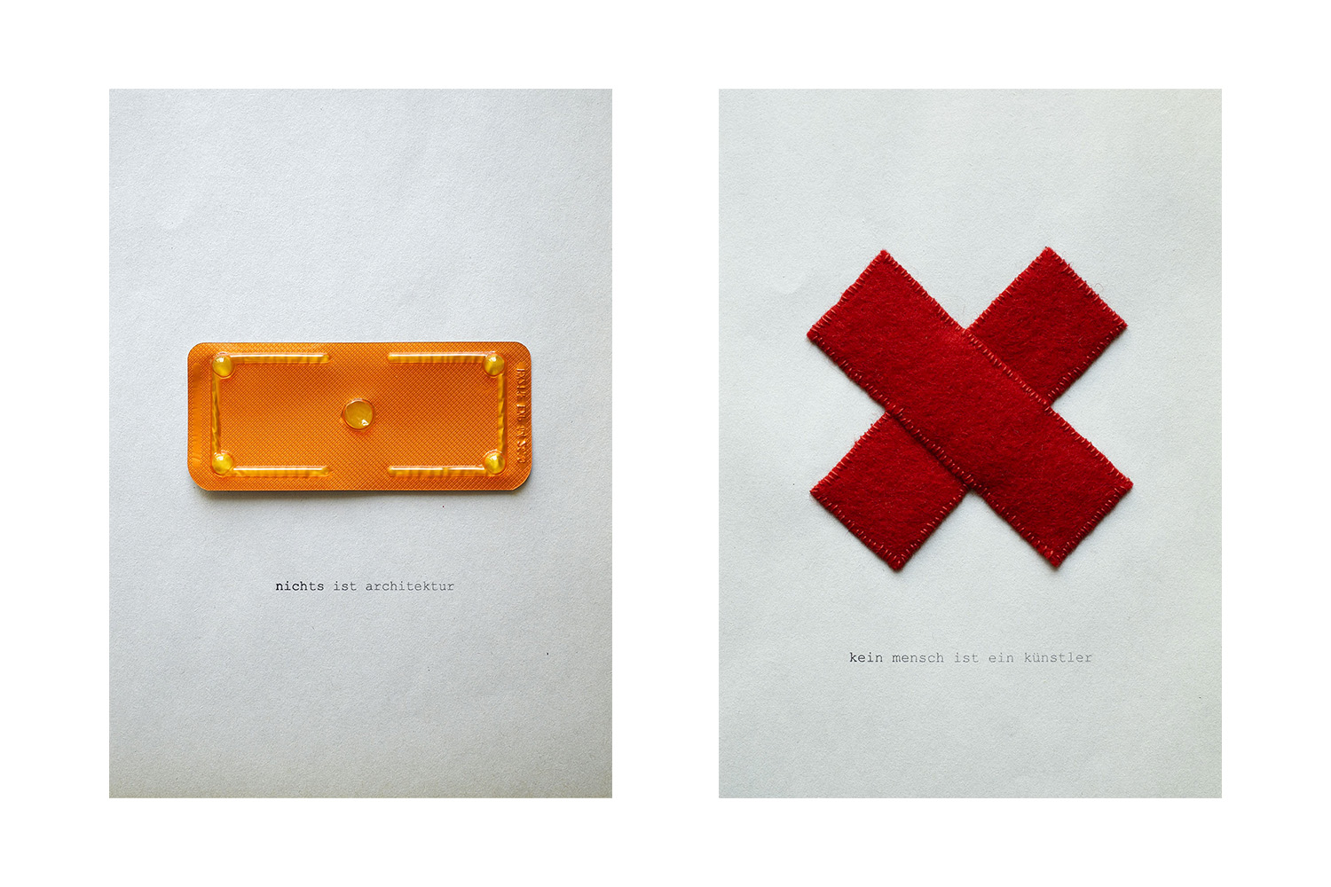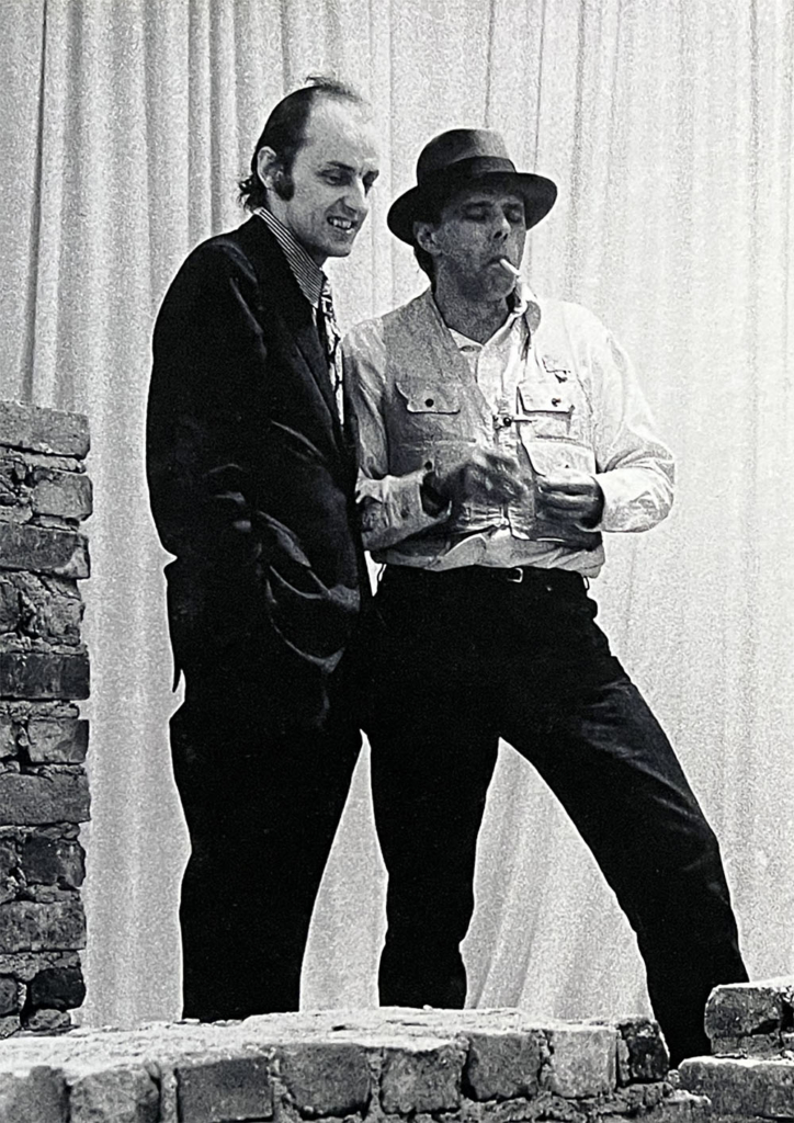 The Morning After Postmodern, 2025Pill package and text on paper21 x 14.8 cm Except Me, 2025Felt and text on paper21 x 14.8 cm Hans Hollein and Joseph Beuys, 1970. Image from transFORMS (2025) at Centre Pompidou